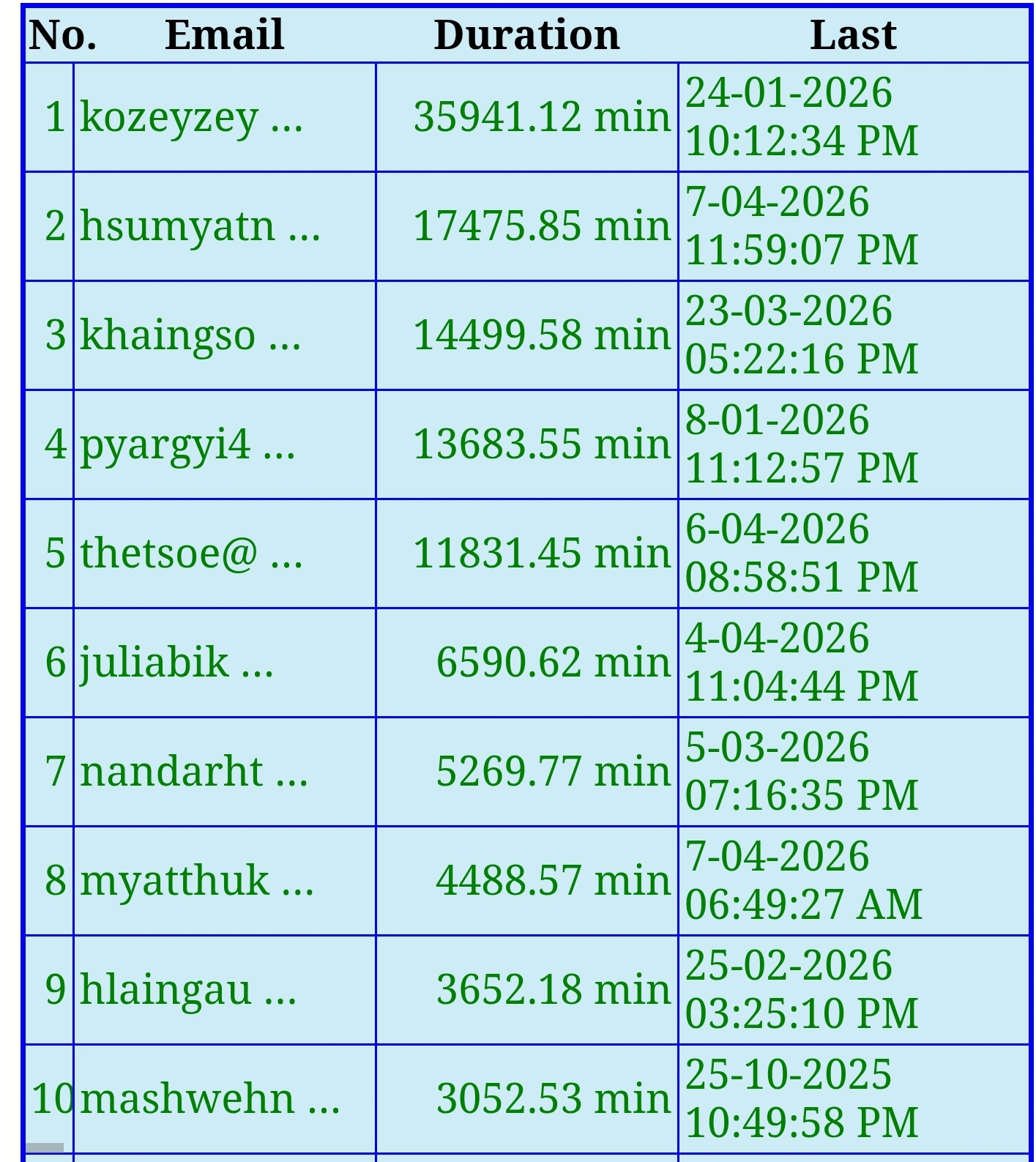 EduCSE Page ပေါ်တွင် ယနေ့ 8-04-26 အထိ အချိန်အကြာဆုံး လေ့လာသူ ၁၀ ဦး