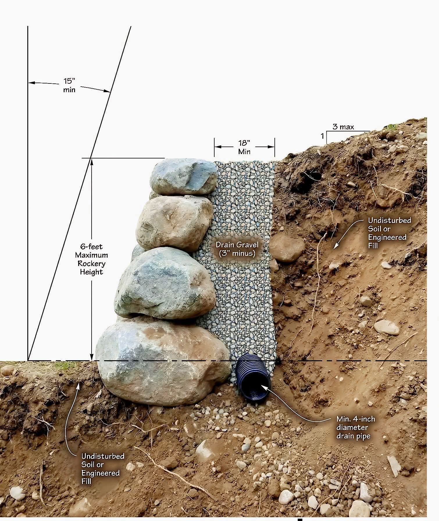 Detailed technical cross-section diagram of a "rockery" or gravity-based stone retaining wall. It serves as a retaining wall to ensure structural stability and proper water drainage.